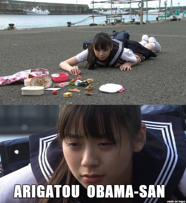 Clearly it's an artist commenting on the failures of Obama's foreign policies and the potential outcome of his TPP deal. Arigatou Obama-san indeed.
