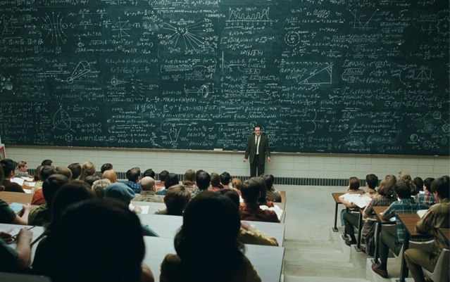 That image is from A Serious Man, by far the most brilliant and under-rated of the Coen Brothers' films. That exact scene (which is a dream sequence) is when the maths professor is explaining the Heisenberg Uncertainty Principle to his students, and ends with the great line "So even though you can't hope to understand anything for certain, you'll still be held responsible for it on the final exam". Given the film is the Coens' take on the Biblical book of Job, it's just a great sequence.