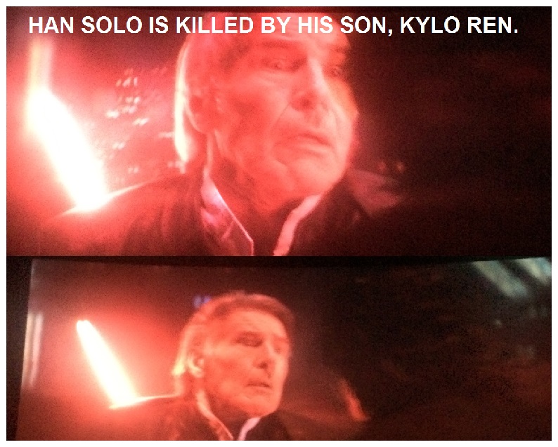 Han and Leia see each other for the first time after many, many years and have a touching conversation about their son: "You can still save him." / "How can I save him when Luke couldn't?" / "Luke was a Jedi, your are his father."