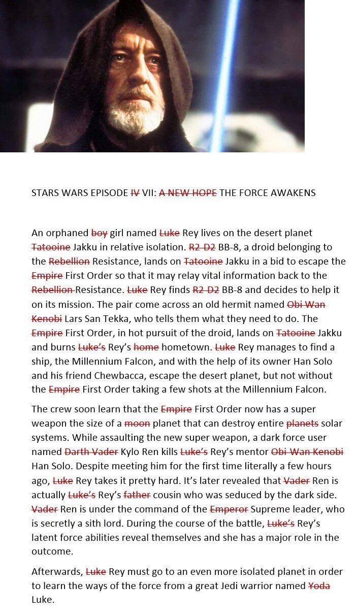 Fan service: Holochess. The levitating training ball from Episode 4. Admiral Ackbar. Rey living in the AT-AT wreckage. "1138" mentioned. Garbage chute and trash compactor mentioned. Kesel Run mentioned.