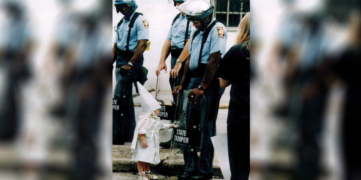 This photo was taken over 20 years ago by Todd Robertson during a KKK rally in northeast Georgia. One of the boys approached a black state trooper, who was holding his riot shield on the ground. Seeing his reflection, the boy reached for the shield, and Robertson snapped the photo. I think the officer’s expression says it all.
