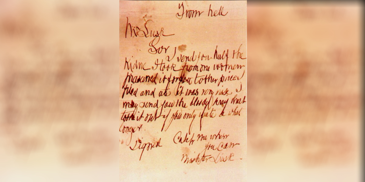 Mr. Lusk, Sir, I send you half the Kidney I took from one woman and preserved it for you. The other piece I fried and ate. It was very nice. I may send you the bloody knife that took it out if you only wait a while longer.