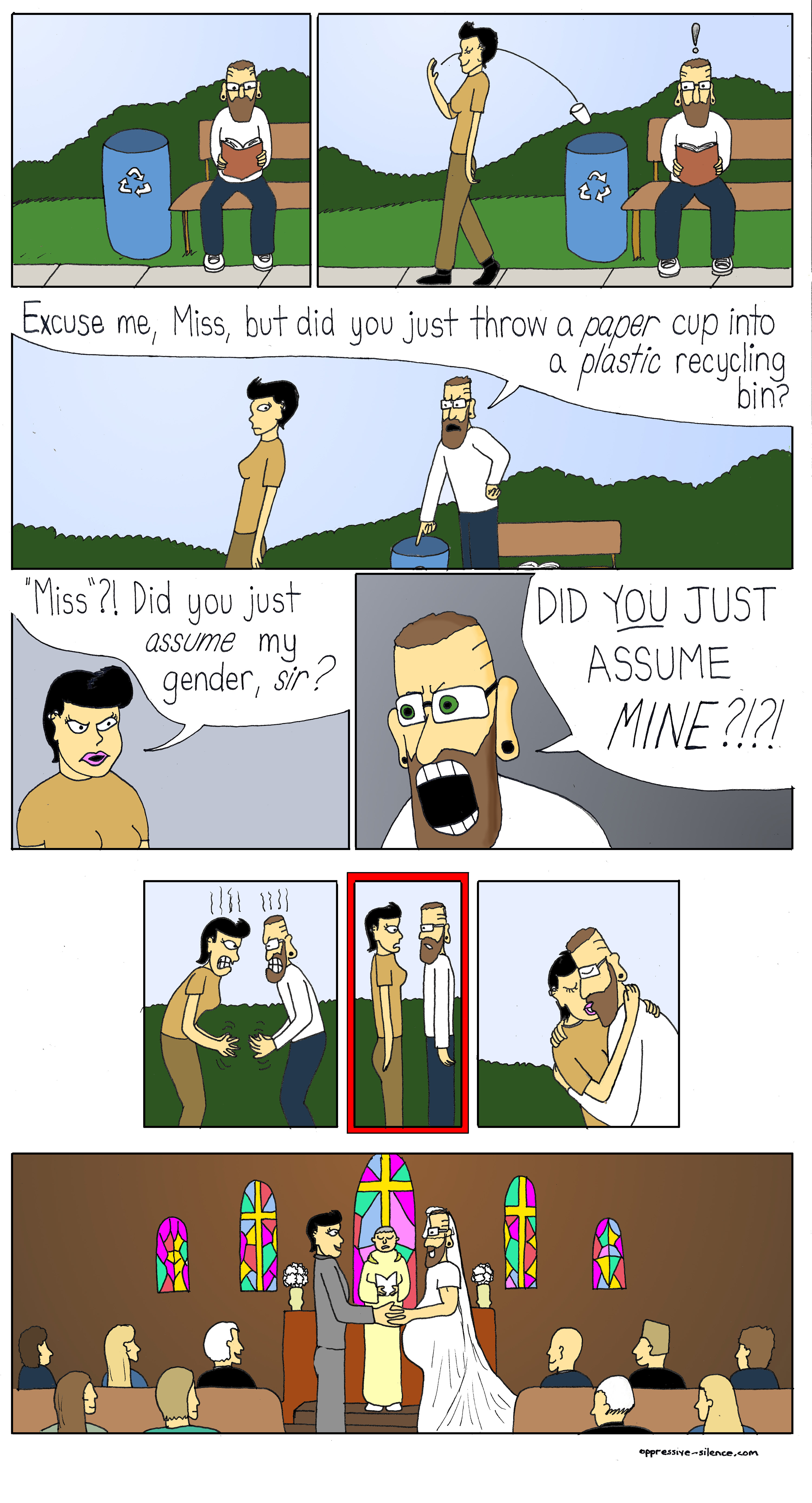 The irony here is that even though they're as sjw as possible they still needed to draw a more or less traditional marriage in a church to show their happily ever after ending.