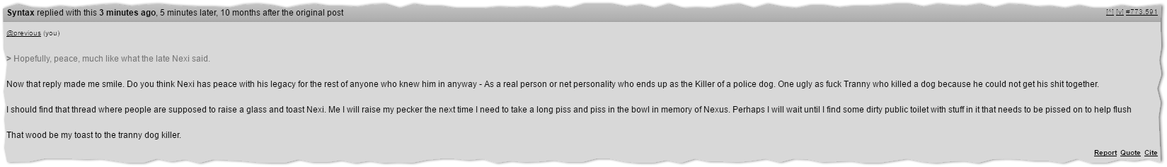 You said you would more or less piss on the dead. That shows great disrespect for the deceased. I thought a man of your age would be more respectful than that. You really should get your tranny hatred under control if you expect to make it in the new world. Just remember, when you die, there is a Fatt Fucker out there that would piss on your deceased body.