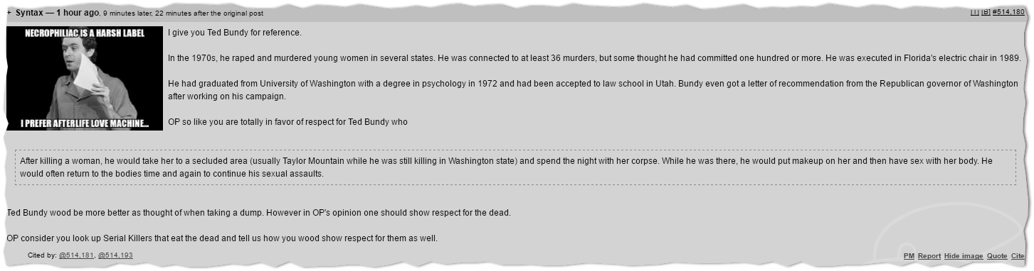OP so like you are totally in favor of respect for Ted Bundy who