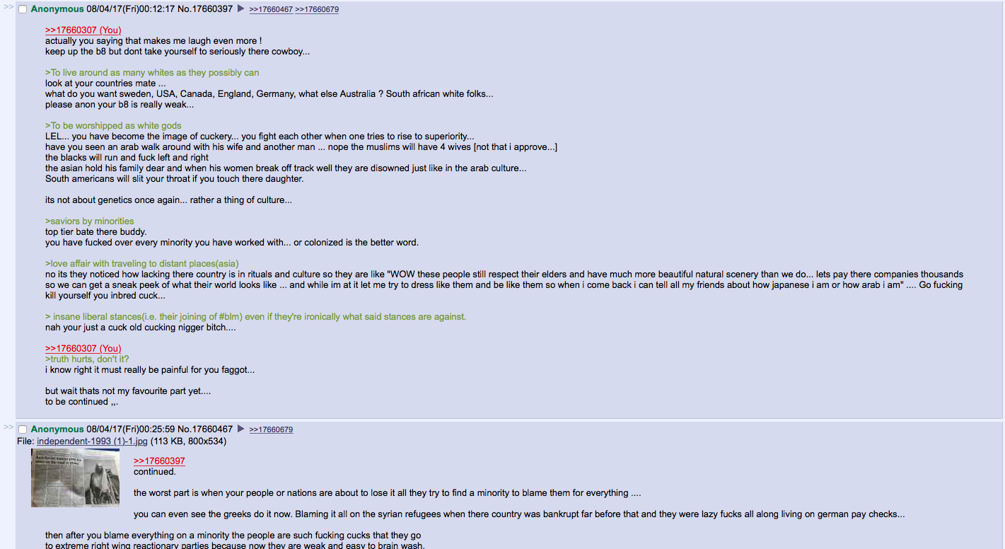 Now, today I got into an argument with an /o/ user who claimed to be an arab of some sort who got angry after I explained to him how whites are very simple to understsand and he blew a gasket lmao.