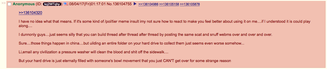 Here's where it starts creeping me out. I'm on a /pol/ thread about china and I run across the same fella again only