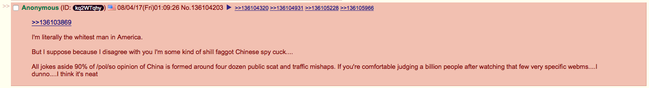this time he's in avid defense of china against the /pol/ users trashing it.