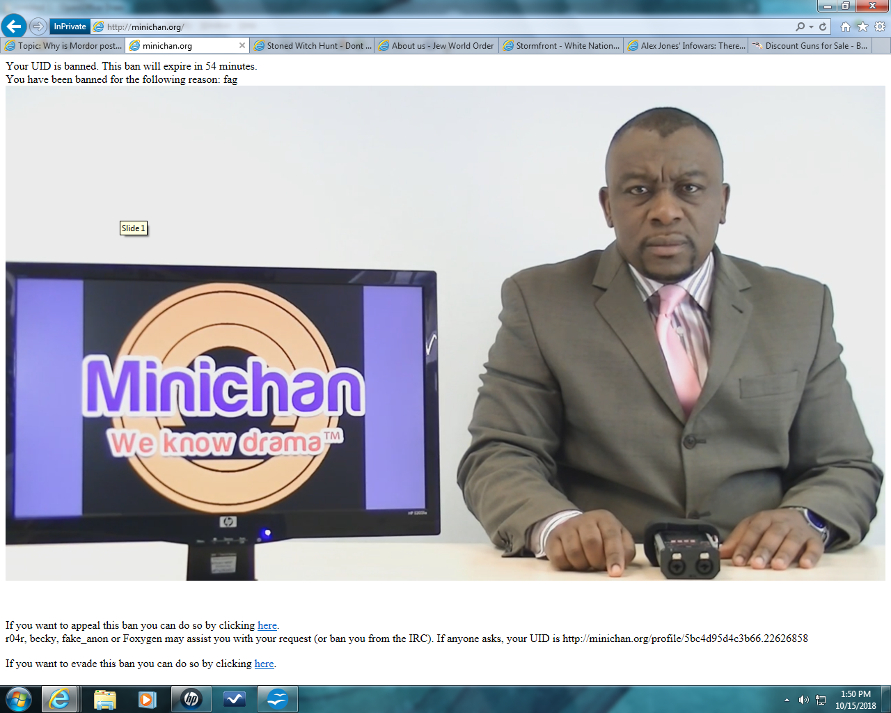MINICHAN BANS ARE PRETTY EASY TO EVADE...I JUST HAD TO WALK TO A DIFFERENT WIFI HOTSPOT EVERY TIME THEY BANNED ME, OR USE INCOGNITO MODE IN CHROME TO GET AROUND THEIR BANS...YOU TECH GUYS PROBABLY KNOW A MILLION WAYS...
