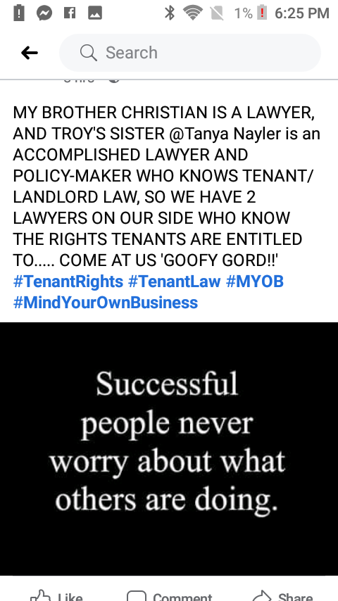 One of Troy Larken's RoomMates is a RAT and a GOOF! He thinks he can complain to the landlord about me living with my boyfriend, but THE LAW CLEARLY STATES THAT THE LANDLORD HAS NO SAY OVER WHAT GUESTS A TENANT HAS LIVING WITH THEM, ESPECIALLY WHEN IT COMES TO ROMANTIC PARTNERS. A TENANT IS UNDER NO OBLIGATION TO EVEN TELL THE LANDLORD THAT THEY MOVED SOMEBODY IN WITH THEM. THE LANDLORD IS NOW TRYING TO TELL ME I CAN'T LIVE WITH MY BOYFRIEND/FIANCEE, BUT THE LAW IS NOT ON THEIR SIDE, AND WE WILL FIGHT TROY'S LANDLORD IN COURT IF WE HAVE TO!! WHERE HE GOES, I GO, BECAUSE WE ARE AN IN-SEPERABLE UNIT.