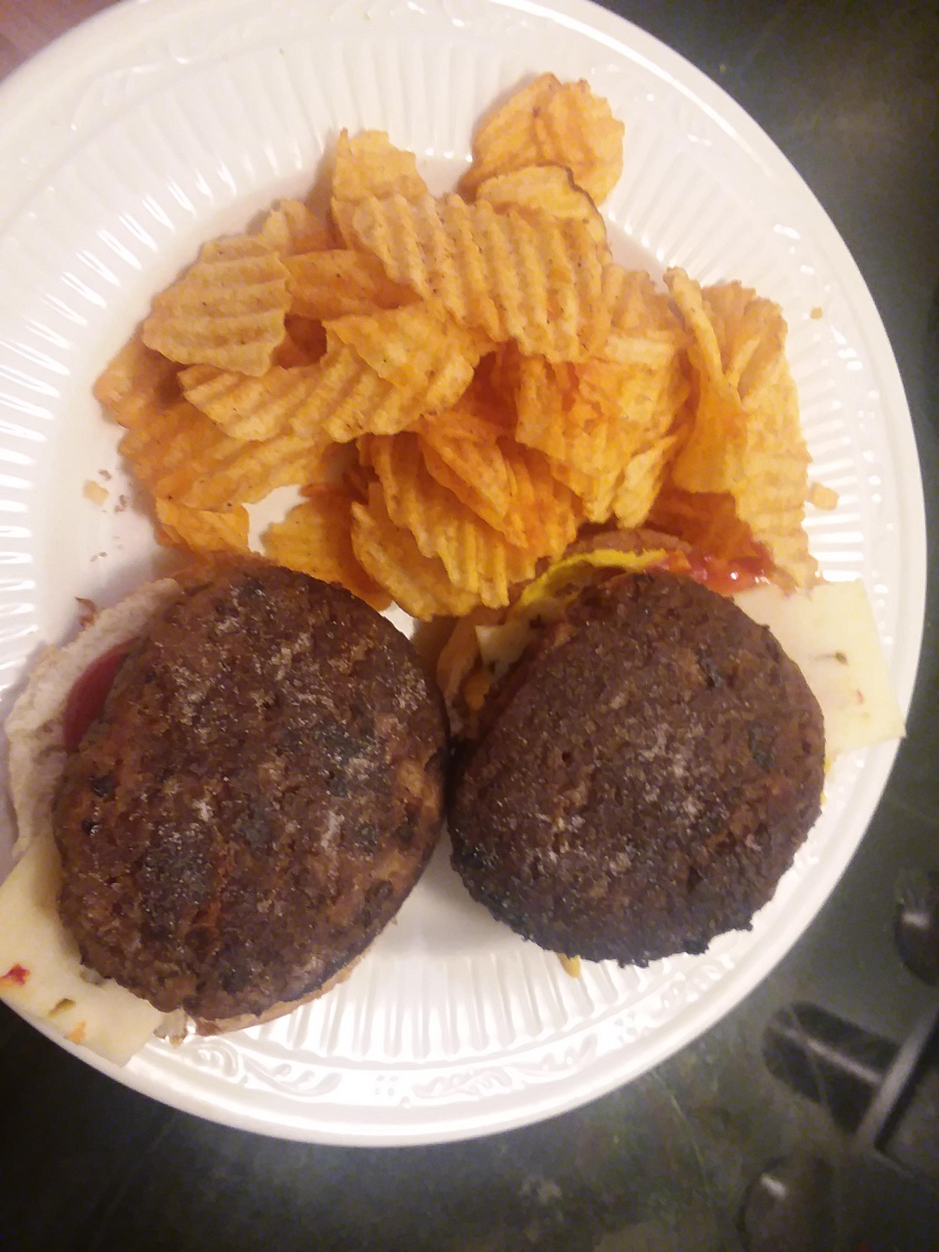 Two hamburgers and some nice Brbeque tater chips.