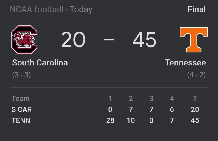 6:46 left in 1st quarter Tn 14 Gamecocks are impotent with zero points.