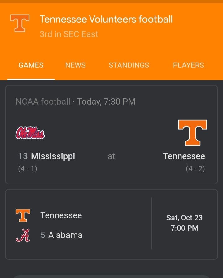 4-2 Tennessee VOLS vs 4-1 Misissippi Rebels.