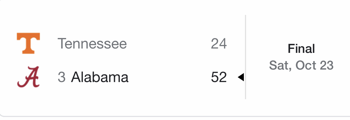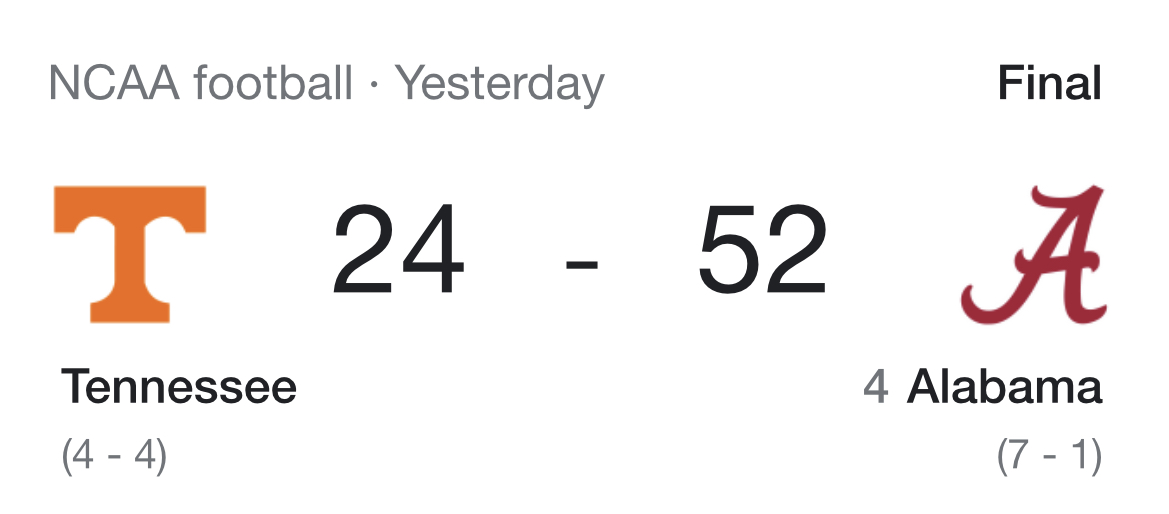 Lol... 15 years straight. Lol. I guess Alabama is just better than Tennessee. Lol...