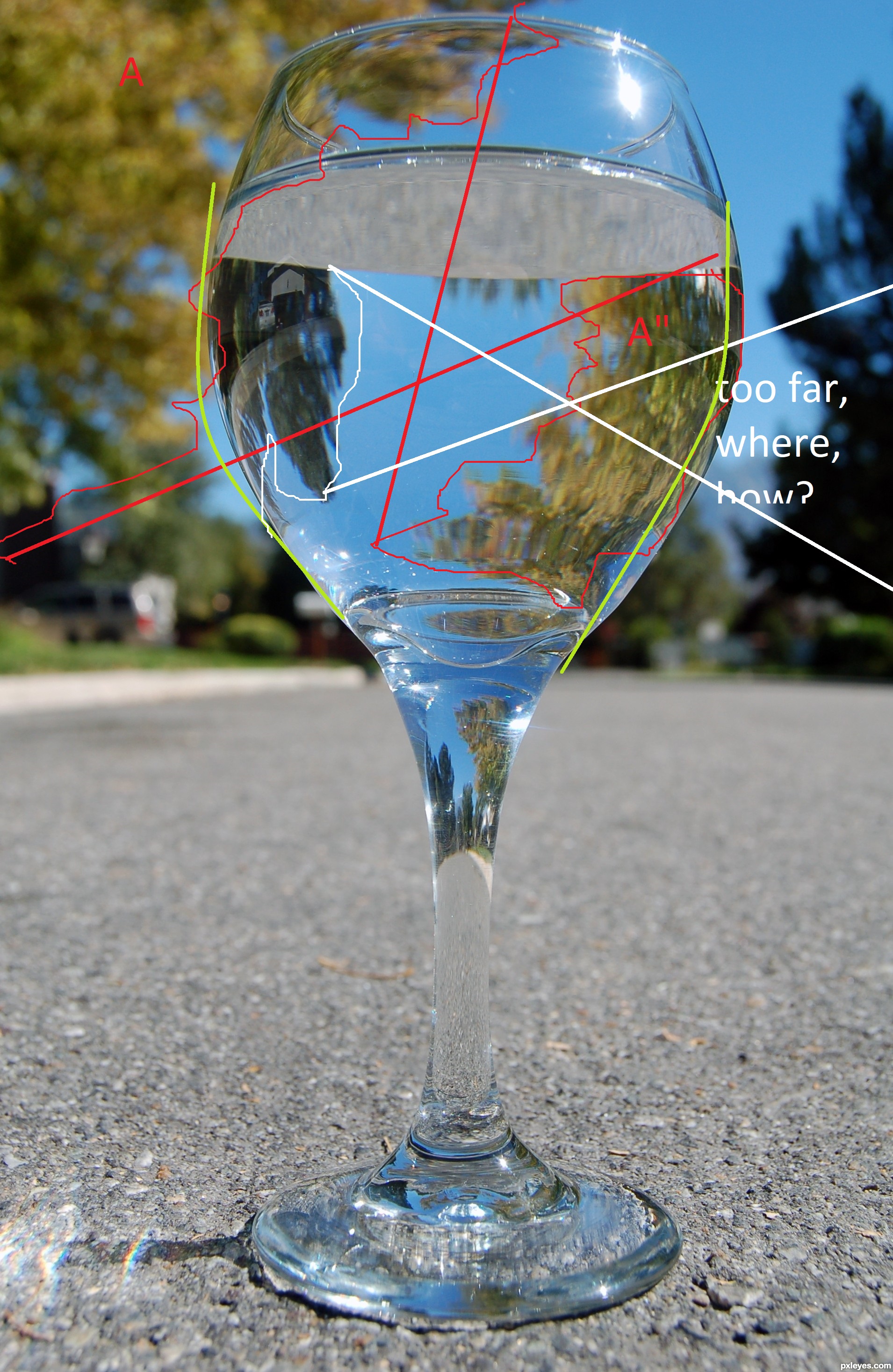 looking for korean or japanese (or english, but preferably two above) tutorial in art that involves painting marble or glass, and most importantly solving refractions, how images at the surface of the object forms based on far away objects, like A' made of A (red) and the white lines means the object came from very distant position which means it dont just , refract, straight to eye, but AWAY, from the eye