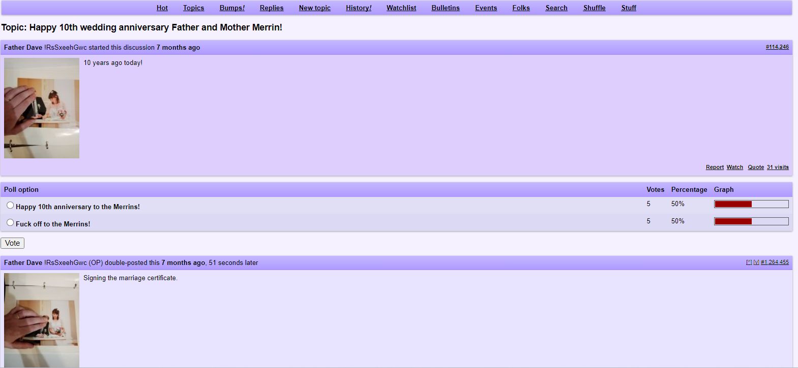 Yes this has been enjoyable. All you fellows have done a great job. When he posted his 10th wedding anniversary I made one fuck up. I didn't get the date of it. Or we could wish him a Happy Anniversary every year ;-) I sat on them pictures for about 6 months. Once they were out I waited. And when Dave didn't take them down, I knew he didn't know where they came from. I had screen shot the original posts anyhow so then I posted the link, and as I figured he went straight to it and deleted them. S0 I then knew there is no doubt they were real. You also need that proof that HE posted them to be able to use them on MC. And I have it with his tripcode and all. Now the mods are between a rock and a hard spot. They allow Matt's pictures he posted to make memes out of, so why should dave get special privileges? Well for now he does...but they will get tired of his shit and then he will have no way to stop them and unless the mods want to alter the rules we should be able to post them at MC once in a while. I still can't believe that jackoff covered his own face but left his wife's out in the open. What a dumbass. He is just a dumbass for posting his wedding pictures! That guy has issues with needing online attention.