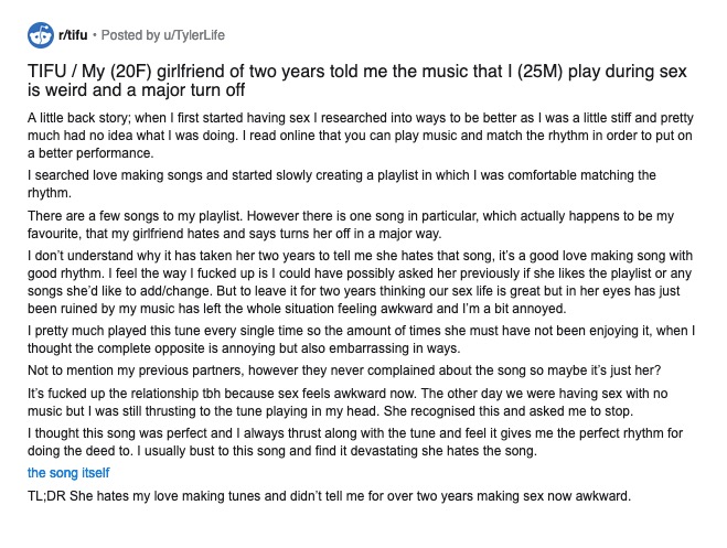 Reddit Guy's Weird Sex Music or Cbat by Hudson Mohawke refers to reactions and memes made about a post to the /r/TIFU subreddit in which a user complains about his girlfriend's frustration with the music he prefers to play during intercourse. The story initially went viral on Twitter, before migrating to TikTok where people attempted to replicate how he would likely thrust to the beat of the song in question, "Cbat" by Hudson Mohawke.